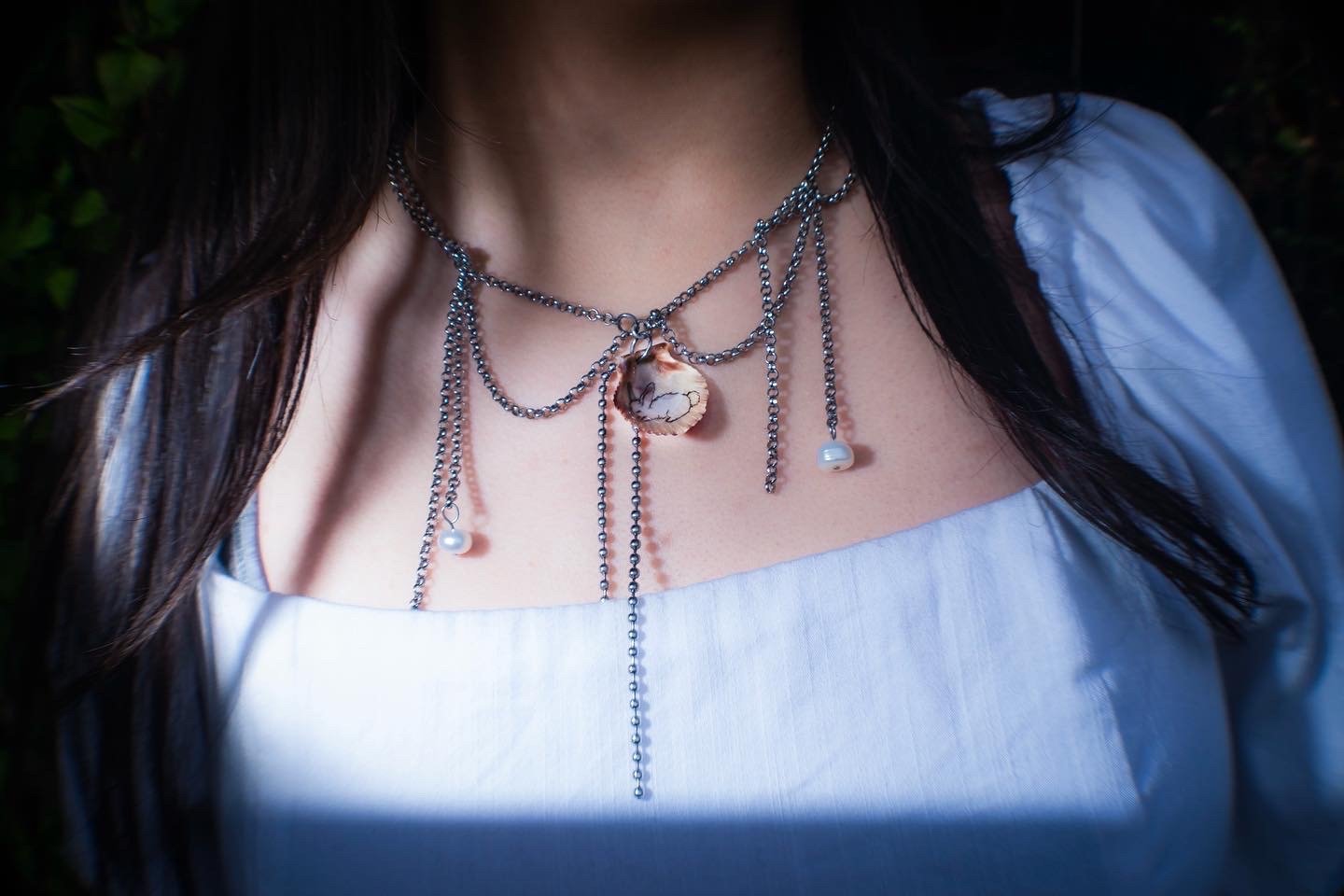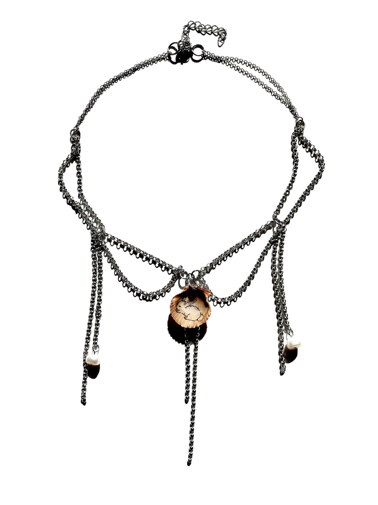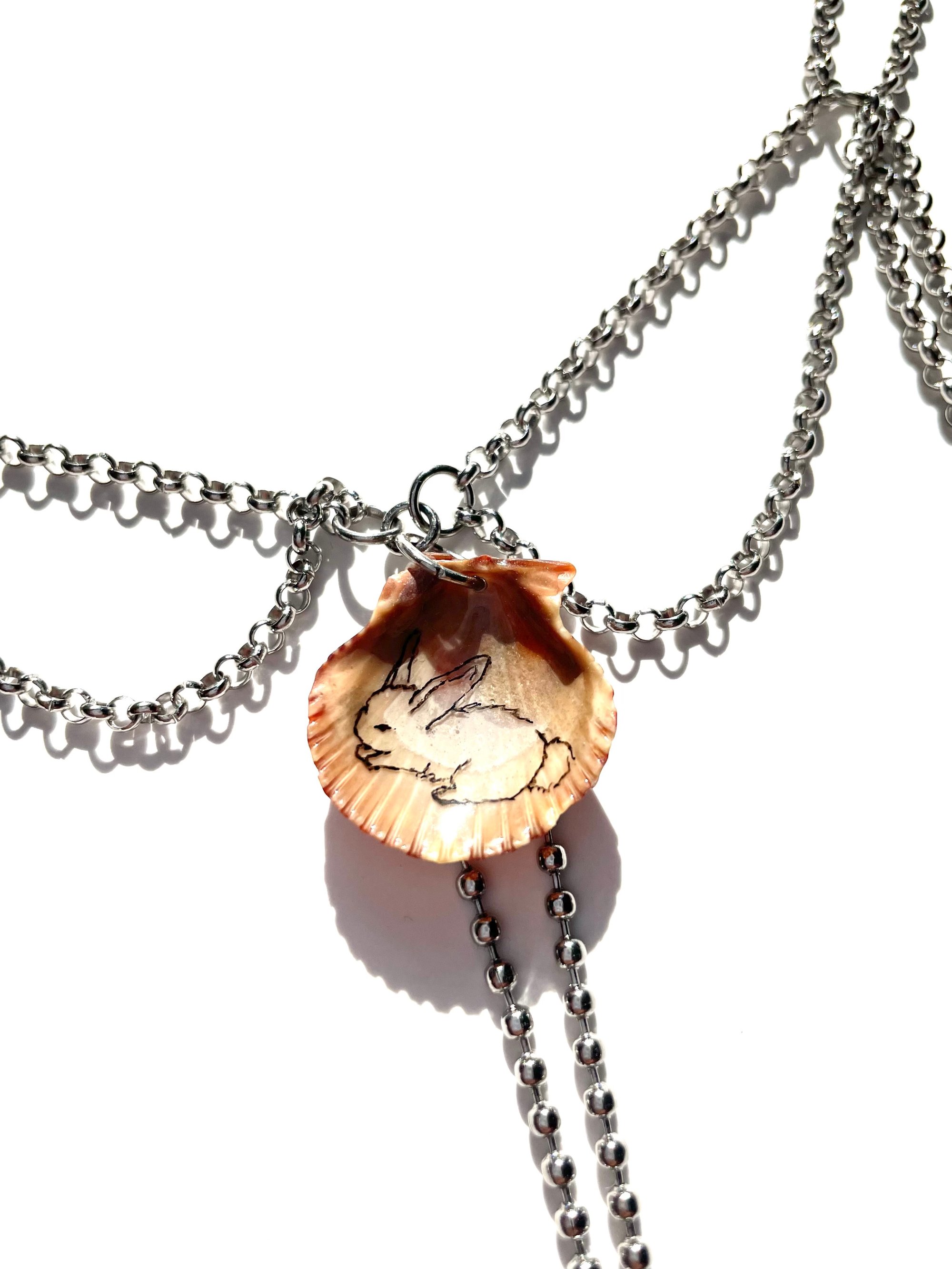 Natural Seashell with the cutest bunny drawing 🫧 Made with non tarnishing stainless steel + natural pearls 🐇 16"-18" length