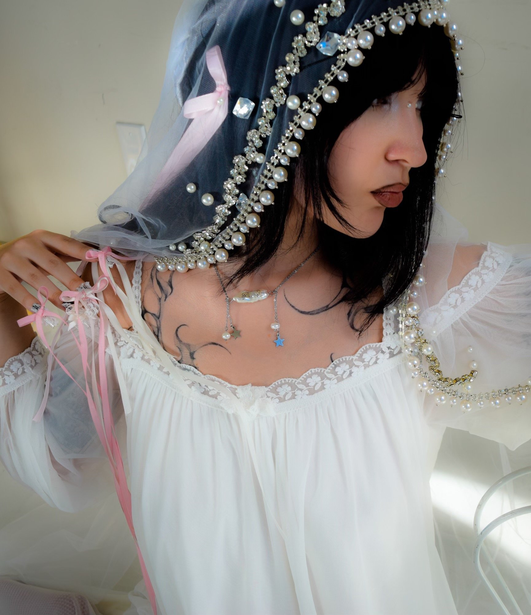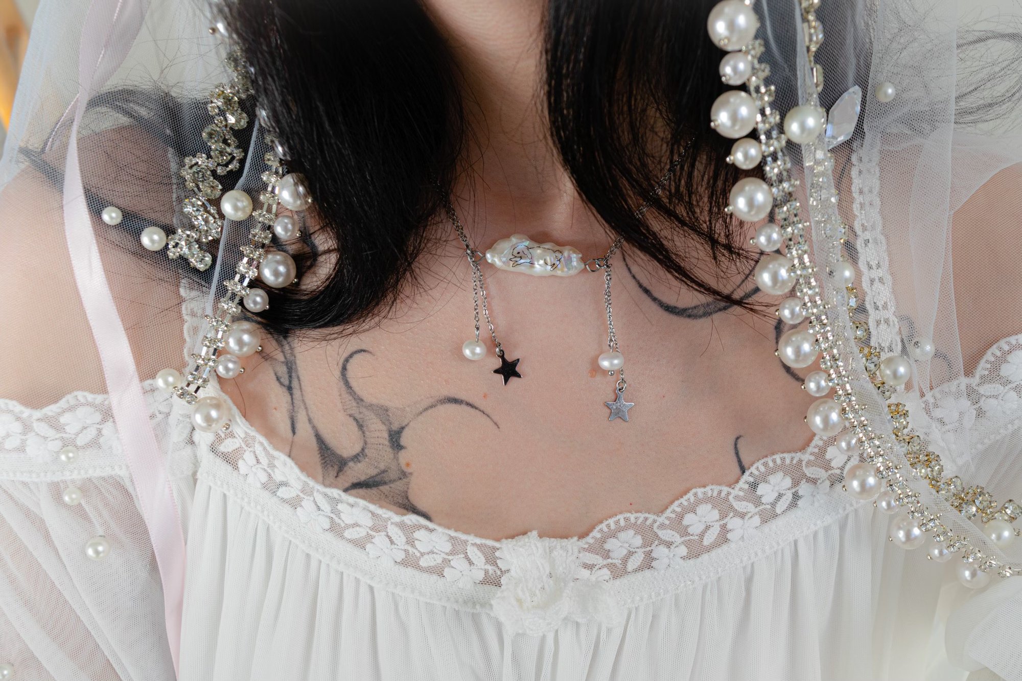 Prancing bunny over the stars and pearls! 16"-18" stainless steel non tarnishing stars and necklace. With natural pearl adornment.