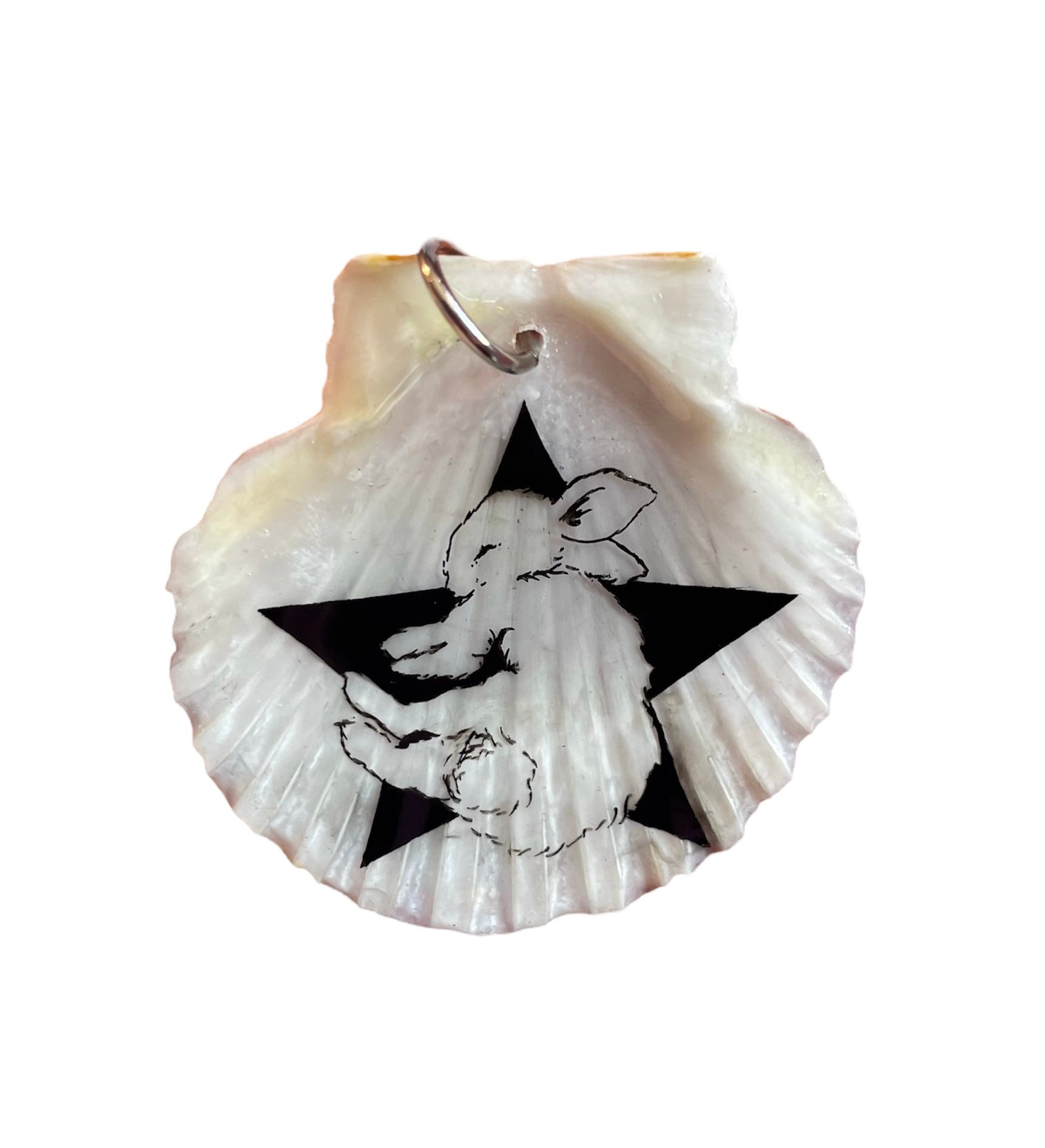 Hand drawn original art on shell, sealed in with resin. Free 18’’ non-tarnishable chain included.