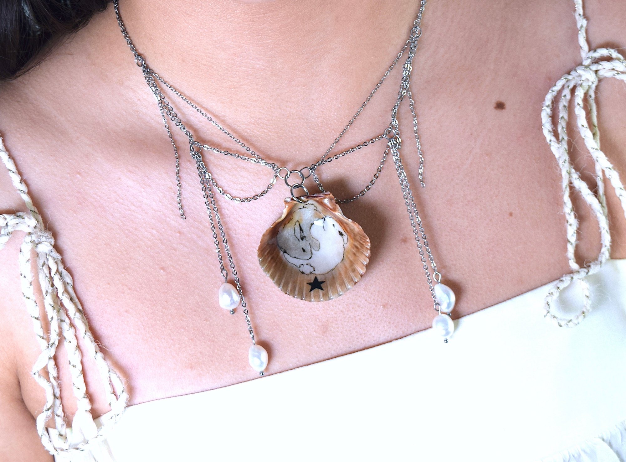 Most precious Yin & Yang bunnies hand drawn, made with natural sea shell and natural freshwater pearls. Chain is non-tarnishing stainless steel. The most sweetest statement piece!